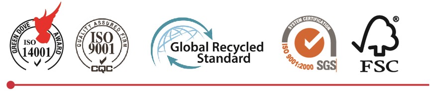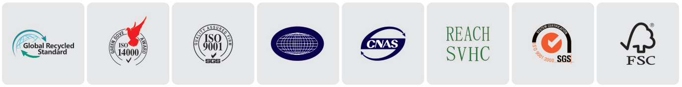 Để thực hiện triết lý phát triển của công ty và đạt được các mục tiêu phát triển bền vững, chúng tôi đã liên tiếp giới thiệu và đạt được các chứng nhận quốc tế trong các dự án hệ thống quản lý, bao gồm hệ thống quản lý chất lượng quốc tế ISO 9001, hệ thống quản lý môi trường quốc tế ISO 14001, chứng nhận của tổ chức kiểm định quốc tế IAF, CNAS, REACH (SVHC), chứng nhận rừng FSC và chứng nhận tiêu chuẩn tái chế toàn cầu GRS.